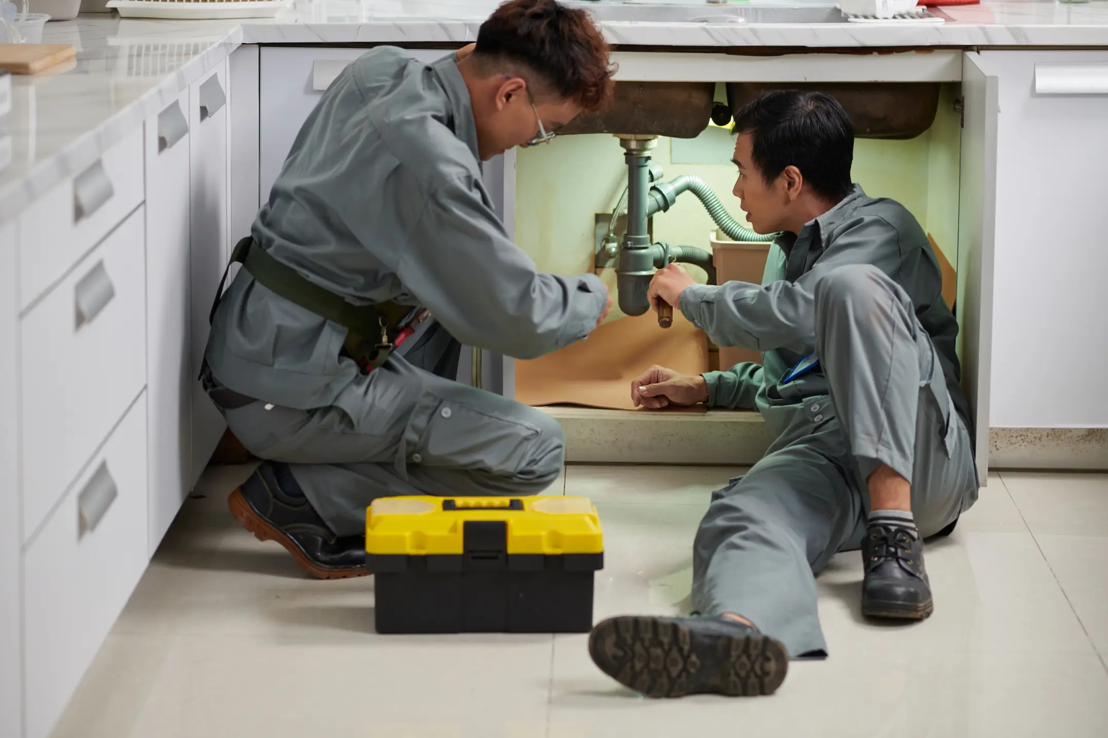 Two plumbers in gray uniforms work together under a kitchen sink.